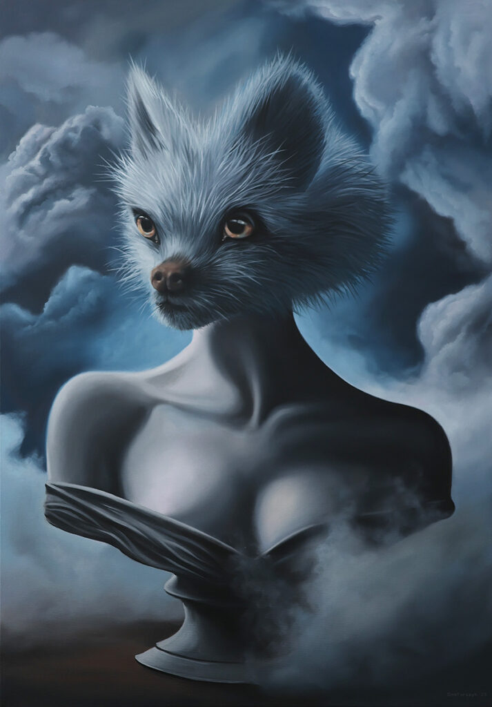 Obraz „Szept absurdu” wprowadza widza w oniryczny, niepokojący świat, w którym granice między człowiekiem, a fantazją się zacierają. Postać o zwierzęcych rysach i ludzkim ciele symbolizuje sprzeczności ludzkiej natury — zwierzęcy instynkt i rozum, realizm i obcość, harmonię i chaos. Tytuł sugeruje cichą, wewnętrzną rozmowę z absurdem istnienia, z tym, co nielogiczne, ale prawdziwe emocjonalnie. Dzieło skłania do refleksji nad tożsamością i nad tym, co w nas dzikie, a co świadome.