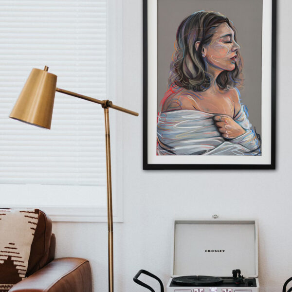 Autorski, kobiecy rysunek wykonany suchymi pastelami na papierze pastelmat.