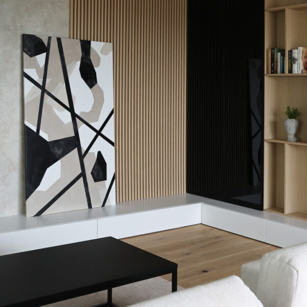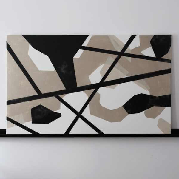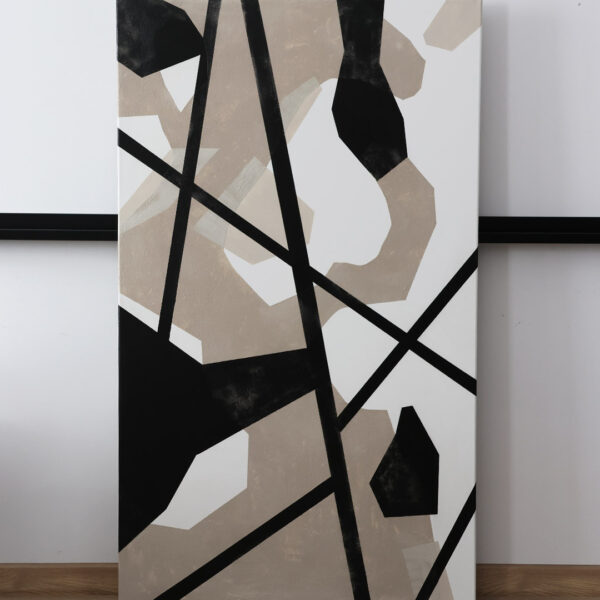Obraz abstrakcyjny w beżu, czerni i bieli.