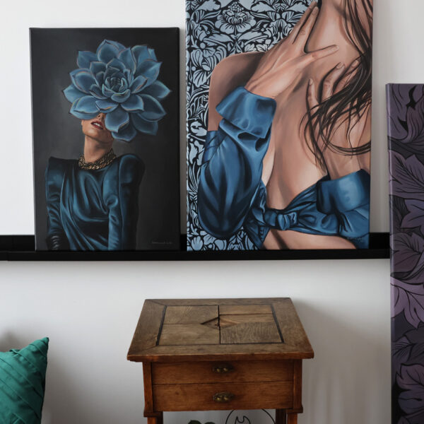 Kobiecy obraz, pełen pasji i tajemniczości z florystycznym akcentem, w odcieniach szarości i błękitów.