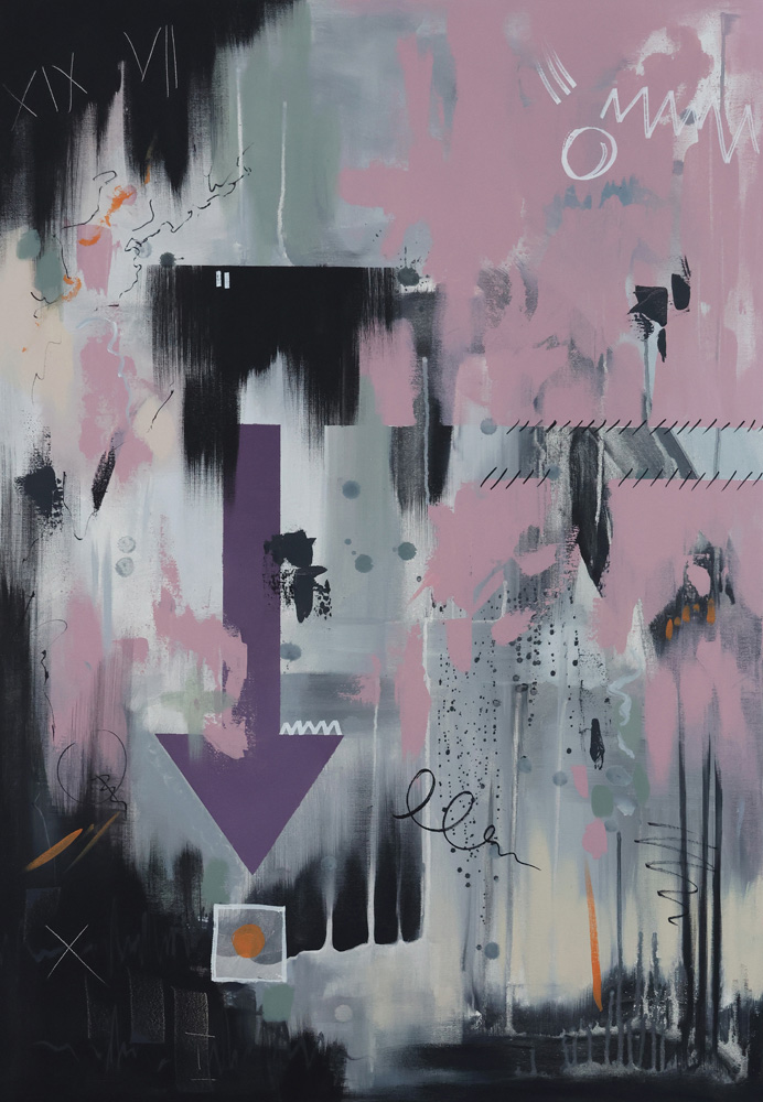 Obraz w odcieniach szarości, czerni i różu z akcentami pomarańczu, fioletu i żółci neapolitańskiej.