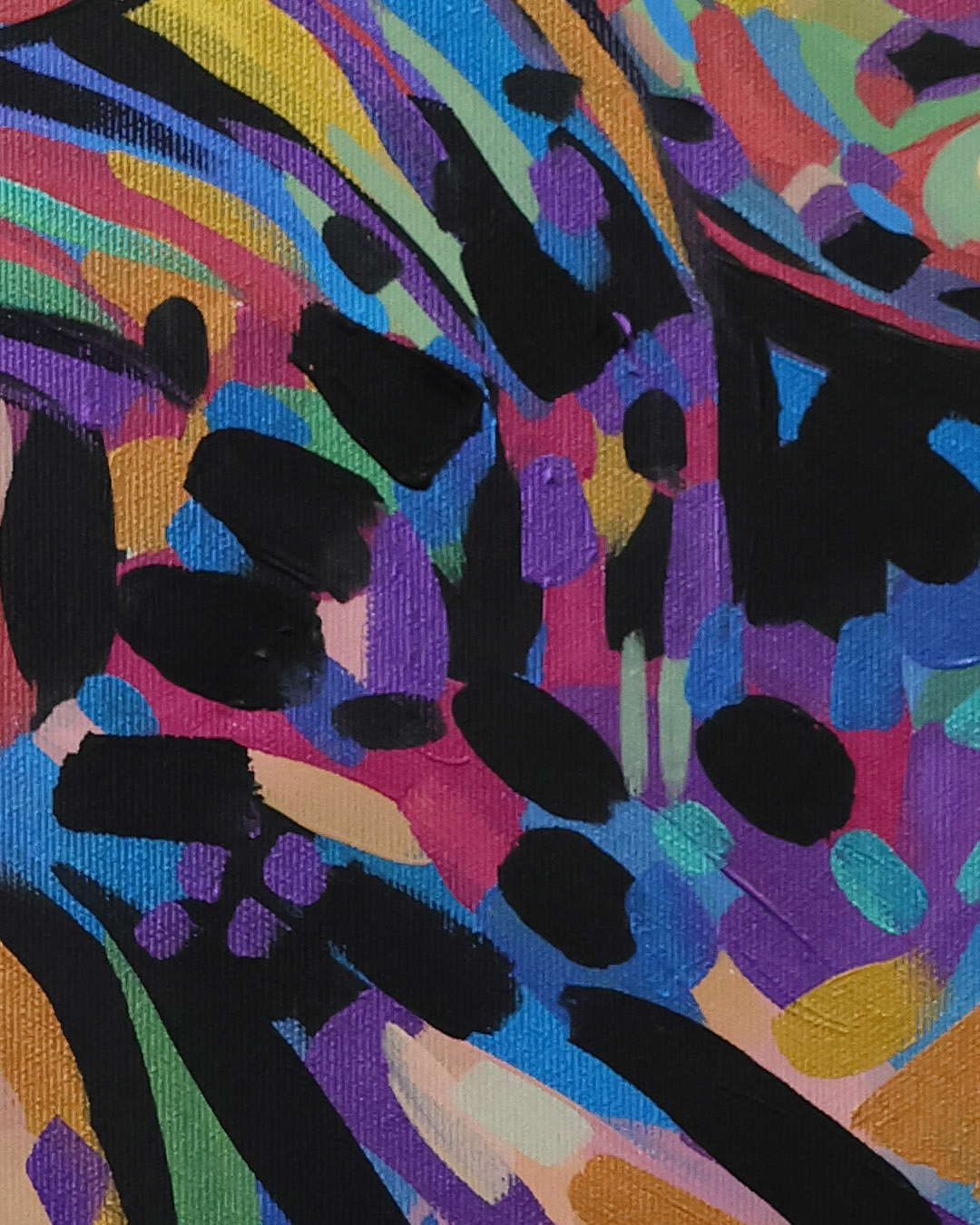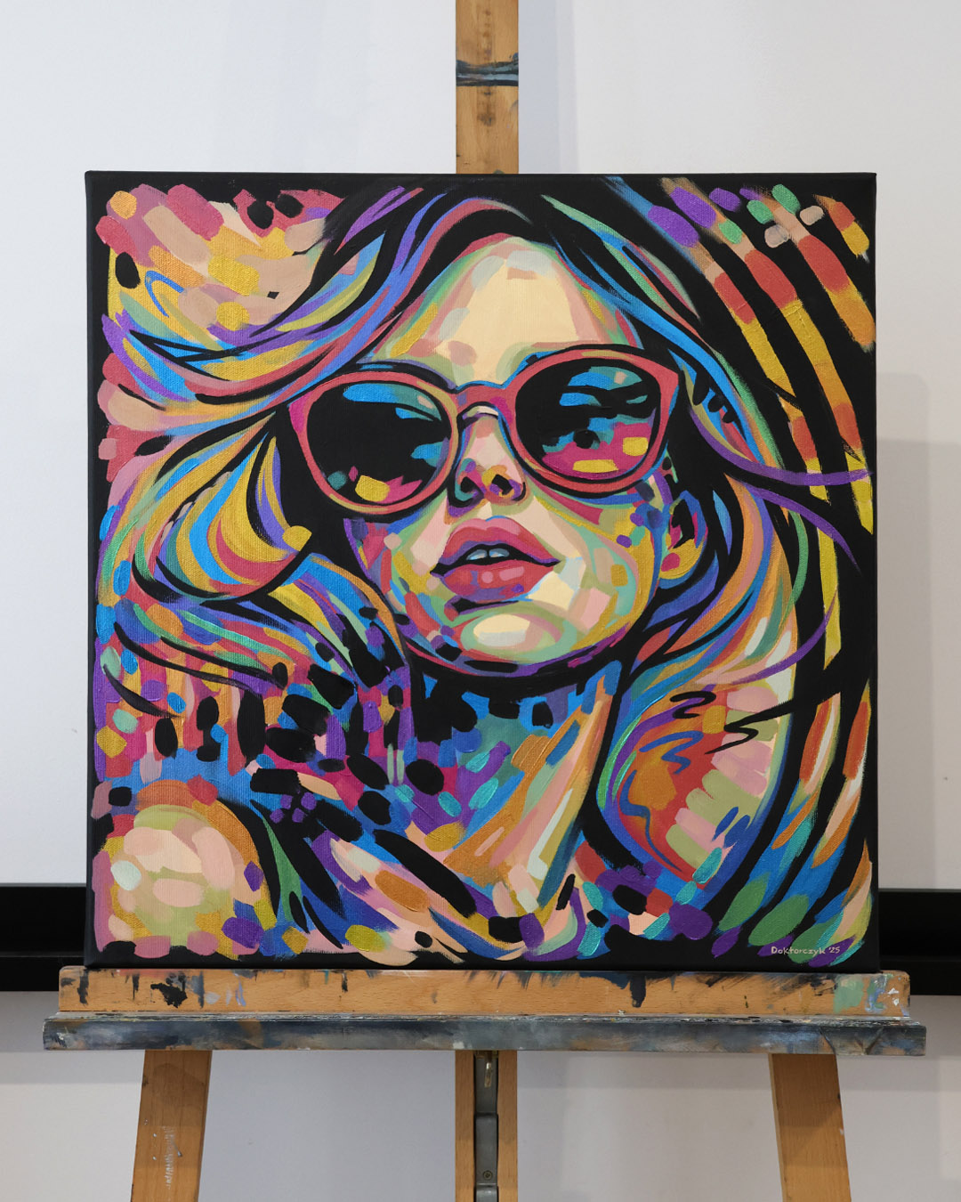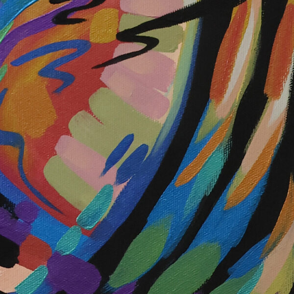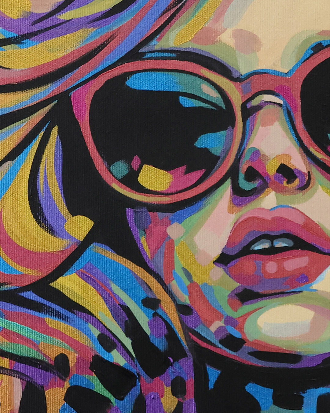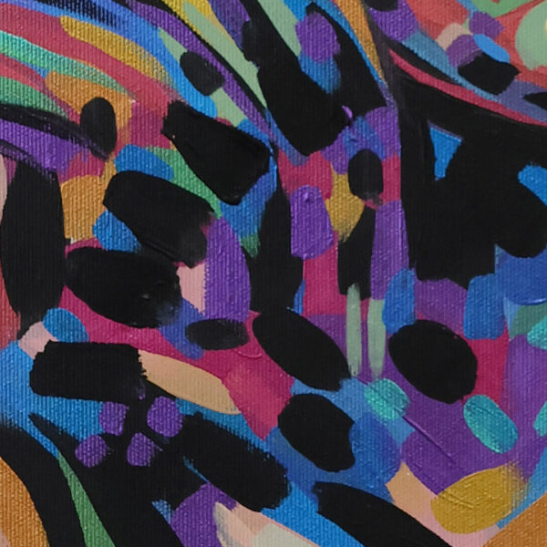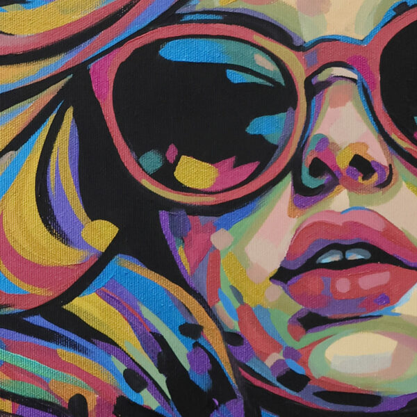 Farby akrylowe na płótnie, zabezpieczone satynowym werniksem. Brzegi obrazu zamalowane na czarno. Z tyłu przybita zawieszka typu „krokodylek”.