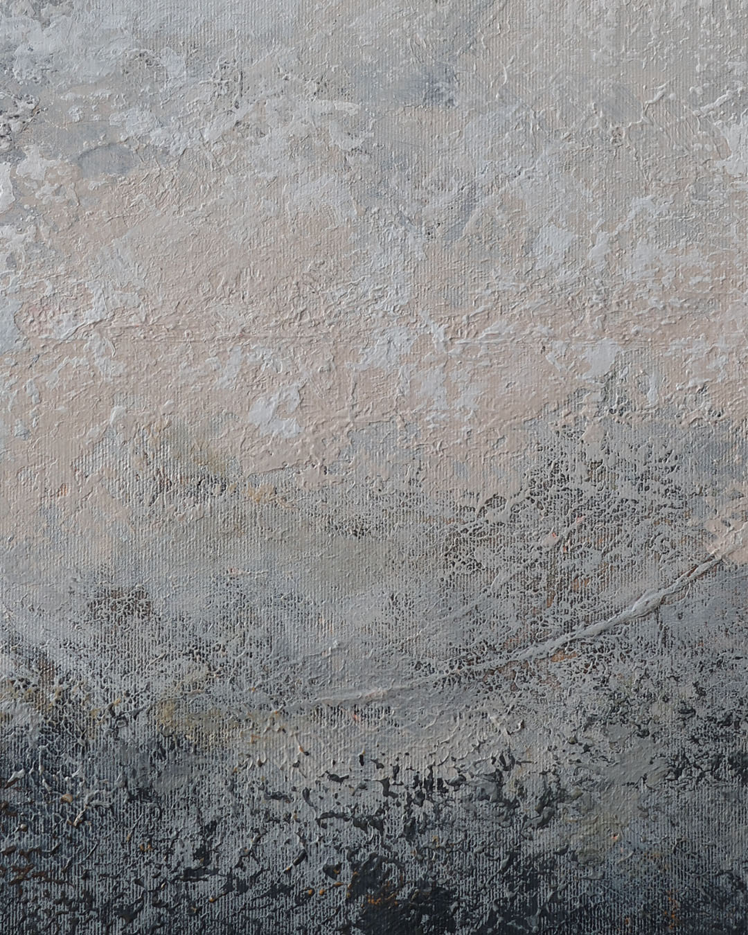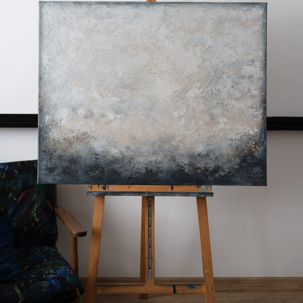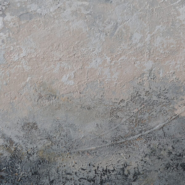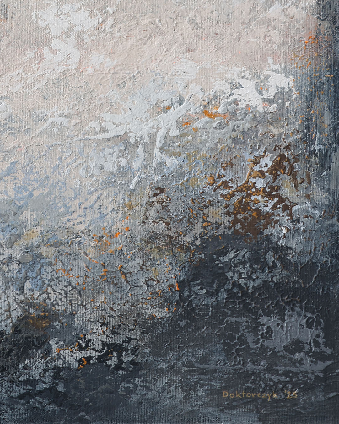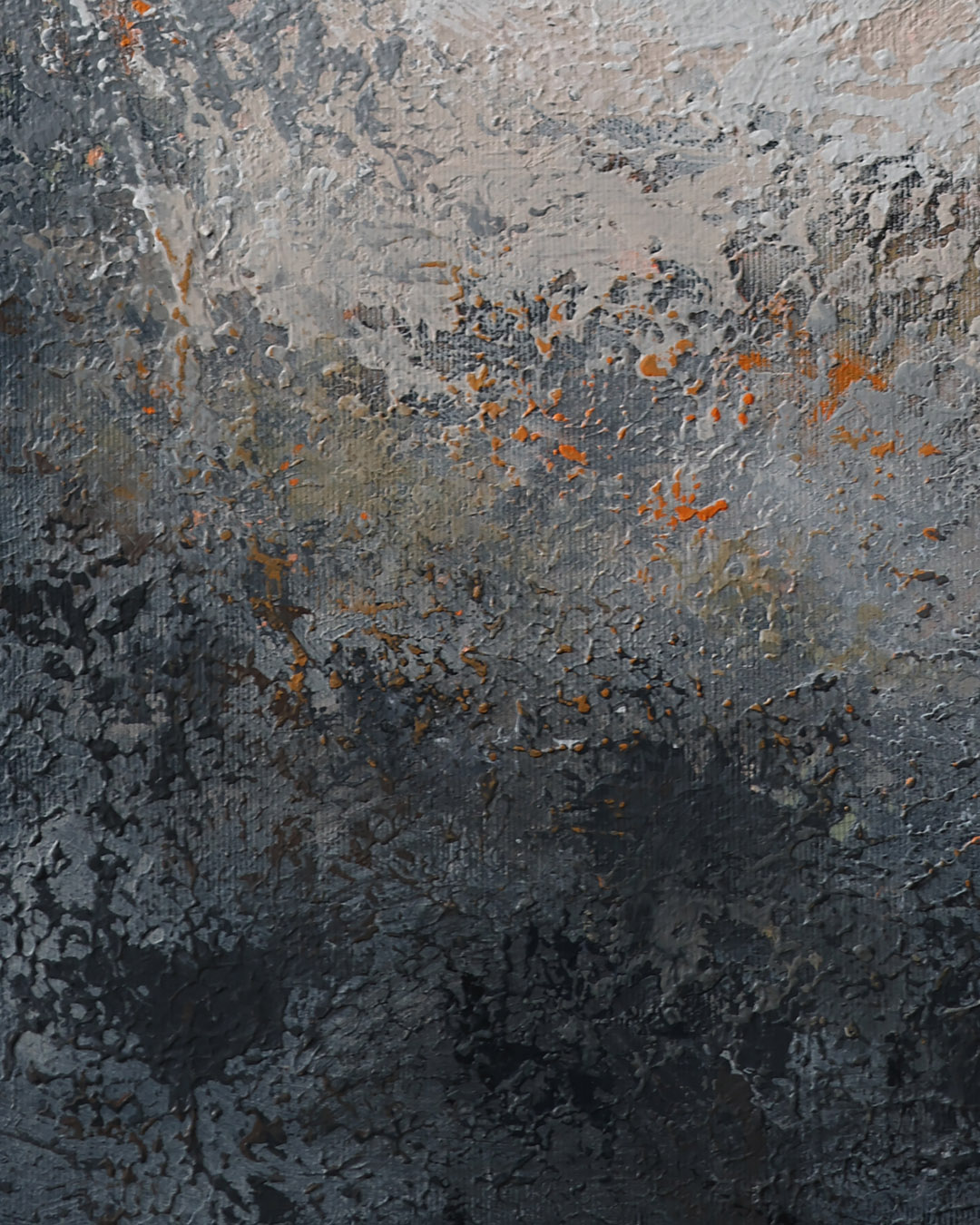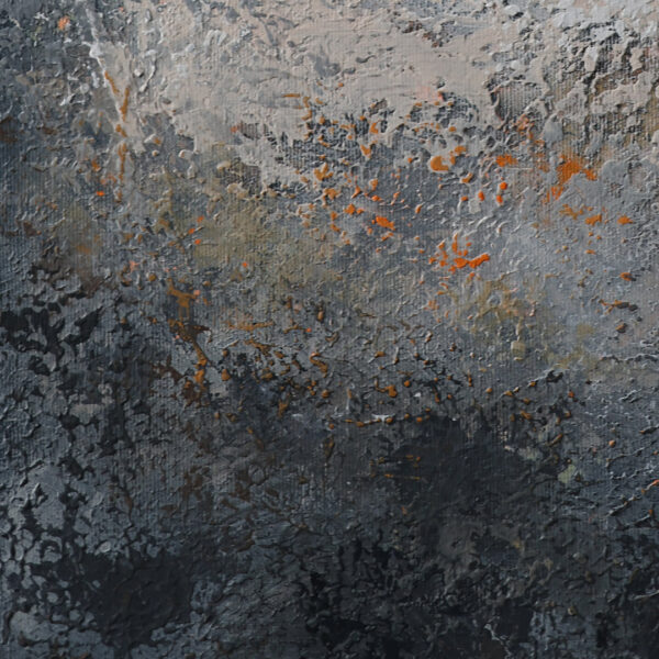 Obraz abstrakcyjny w odcieniach ciepłej i zimnej szarości, czerni i bieli, z drobnymi pomarańczowymi akcentami.