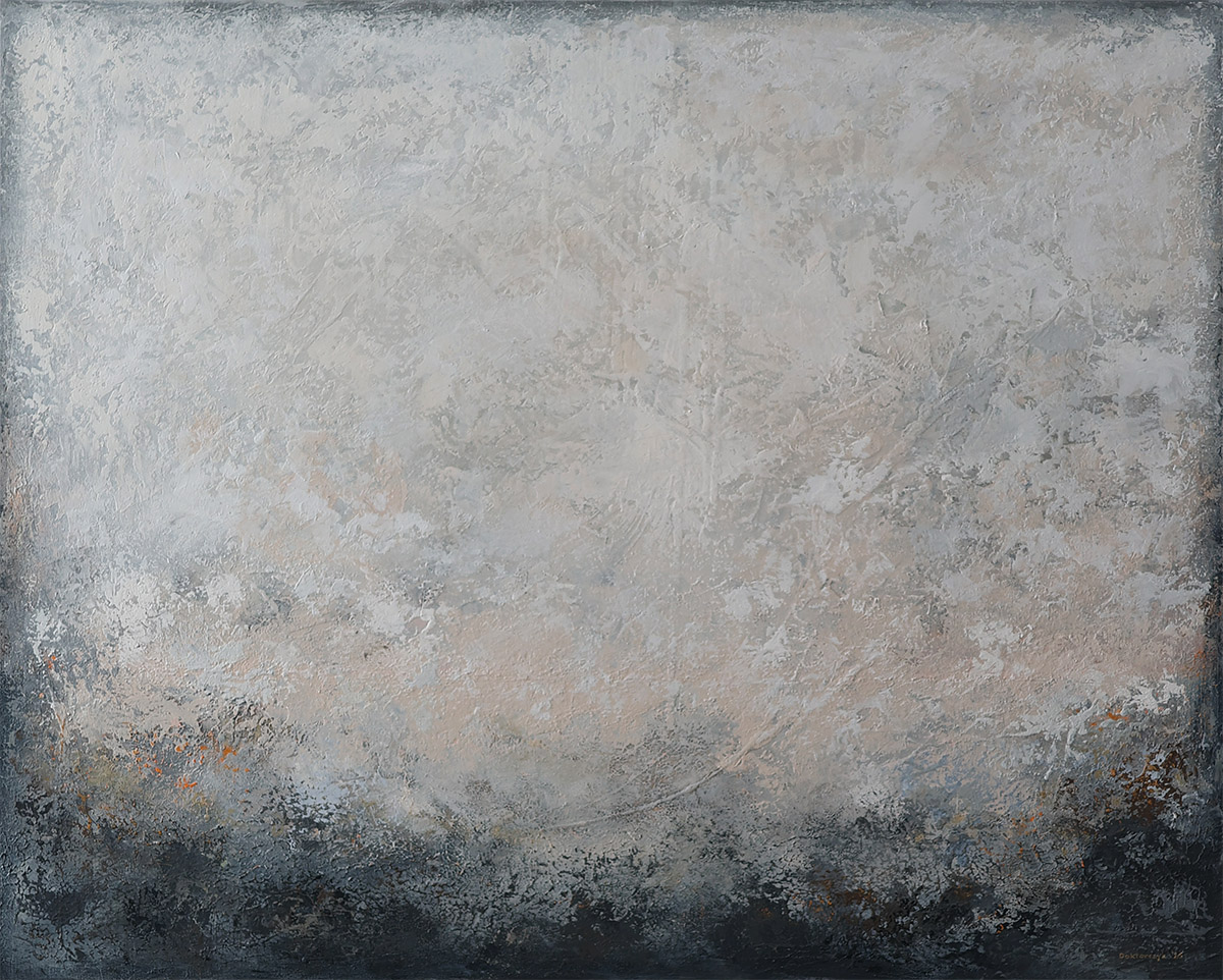 Pasta strukturalna, farby akrylowe na płótnie, zabezpieczone satynowy werniksem. Brzegi obrazu zamalowane.