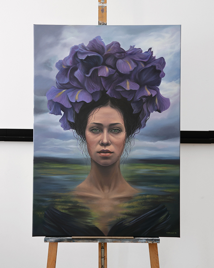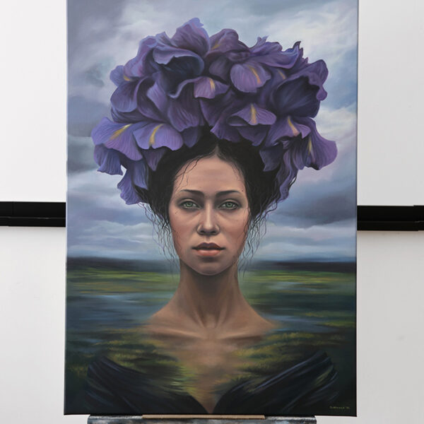 Obraz „Zanim przeminie” ukazuje głębokie połączenie człowieka z naturą i refleksję nad przemijaniem. Kobieta wyrastająca z pejzażu, z kwiatami na głowie, symbolizuje jedność z ziemią i cykl życia. Jej spokojne spojrzenie niesie harmonię i akceptację tego, co nieuchronne. Tytuł podkreśla ulotność chwili – przypomina, by dostrzec piękno świata i własnego istnienia, zanim odejdzie w przeszłość.